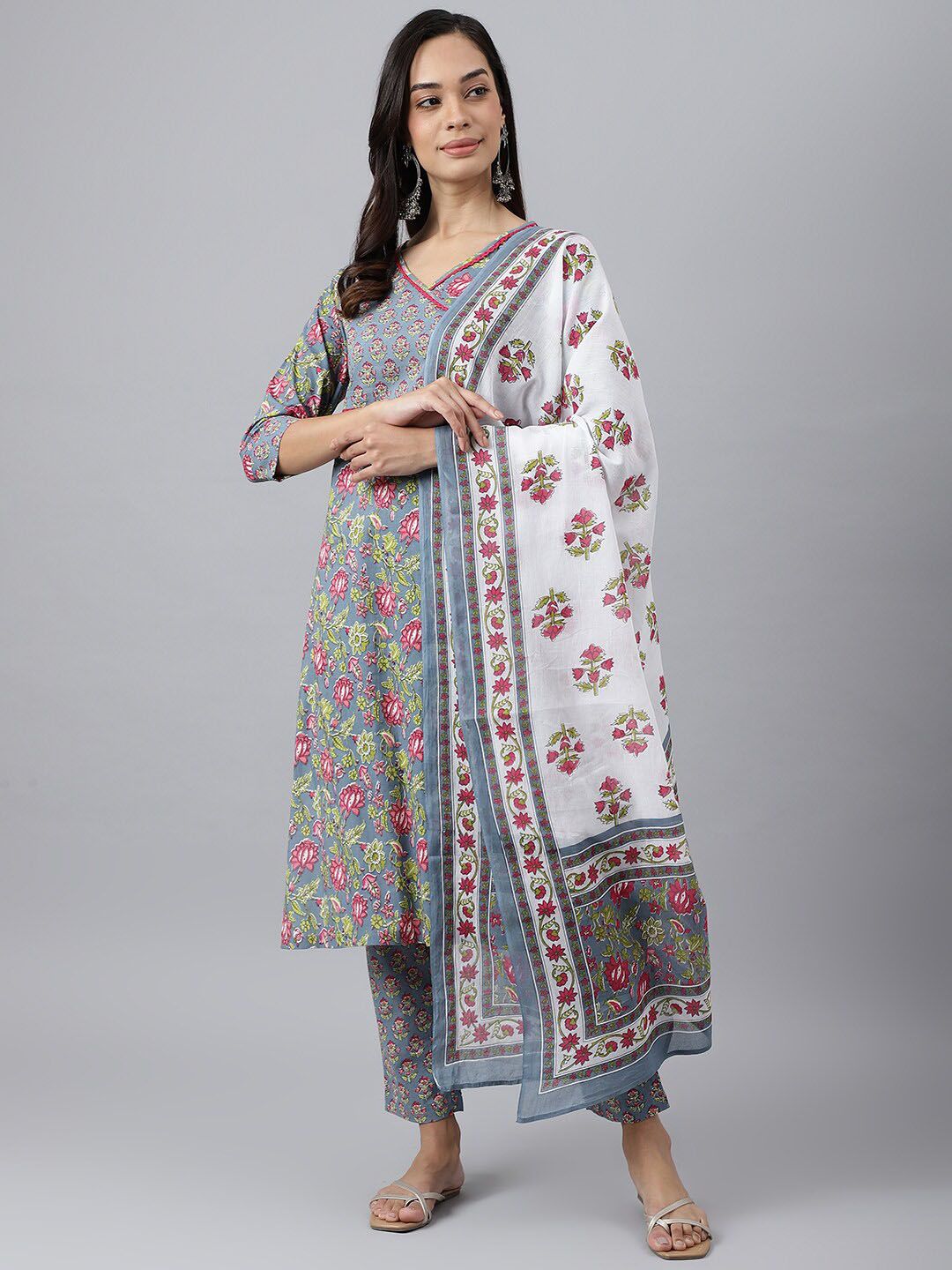 KALINI Floral Printed Angrakha Pure Cotton Kurta with Trousers & With Dupatta