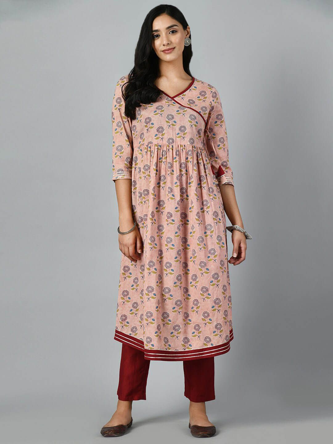 KALINI Floral Printed V-Neck Angrakha Cotton A-Line Kurta