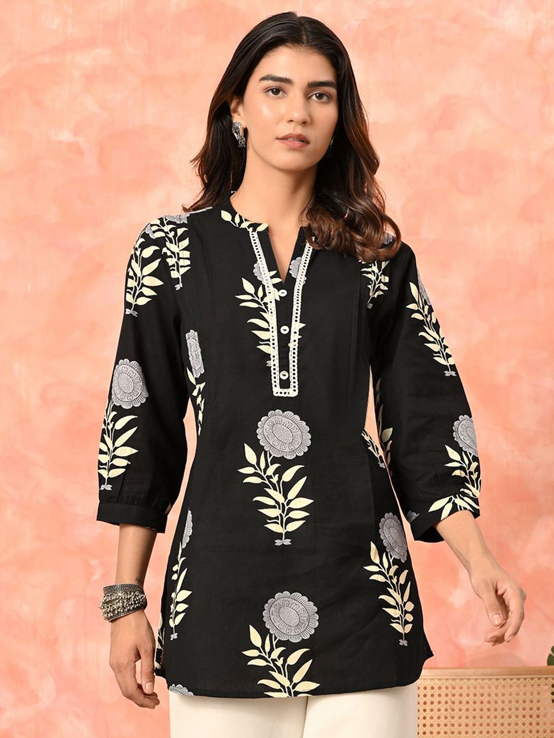 Sangria Women Ethnic Printed Cotton Mandarin Collar Tunic