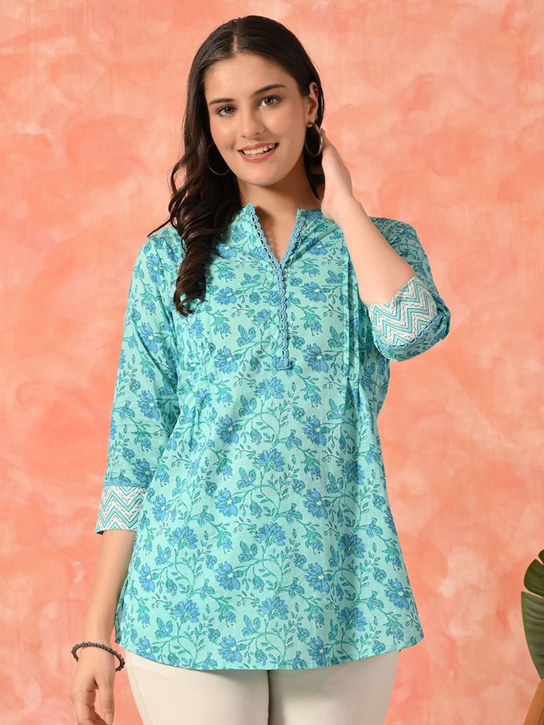 Sangria Women Floral Printed Mandarin Collar Cotton Tunic