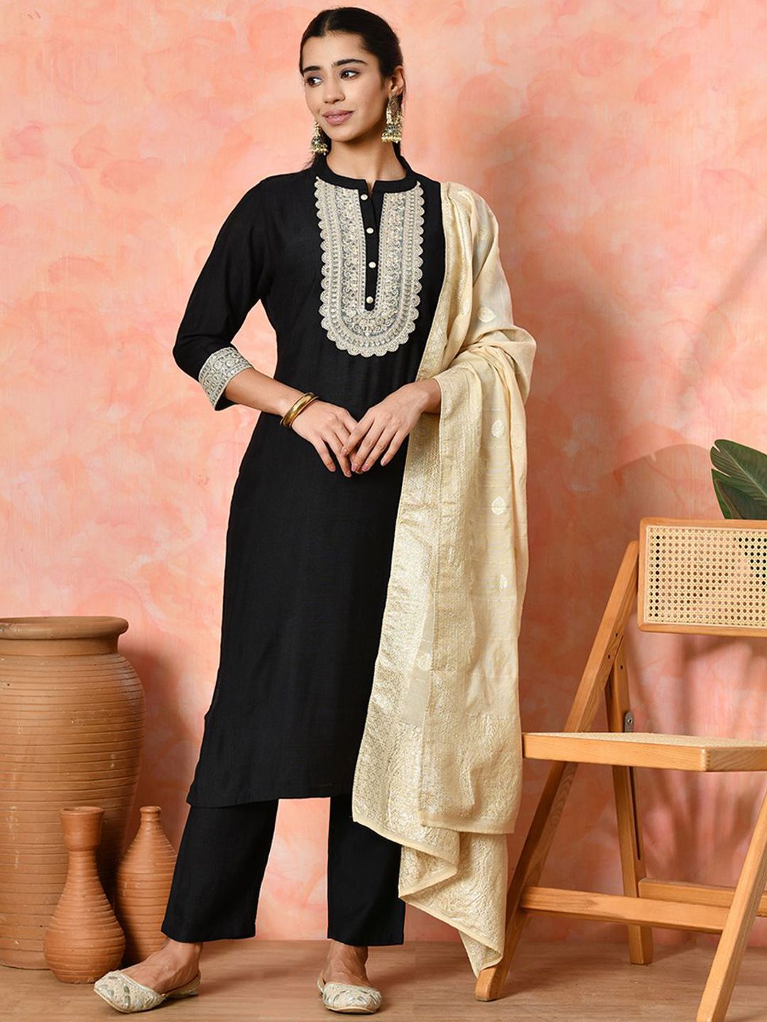 Sangria Women Solid Yoke Design Kurta with Trousers & Dupatta